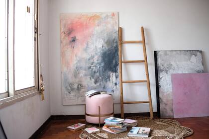 Flor armó su espacio de trabajo en el antiguo dormitorio de sus abuelos. La obra de la artista Romina Haiatzanian se lleva todas las miradas y es uno de sus objetos preferidos. Fue amor a primera vista: "Fui a hacer fotos a su taller y a la noche no podía dormir, pensando en el cuadro. Al día siguiente la llamé y le dije que lo quería". Para completar la escena, lindos objetos: escalera (Gea Interiores), alfombra (Punto Calma) y puf (Casa Lulu).