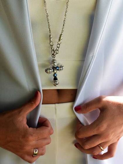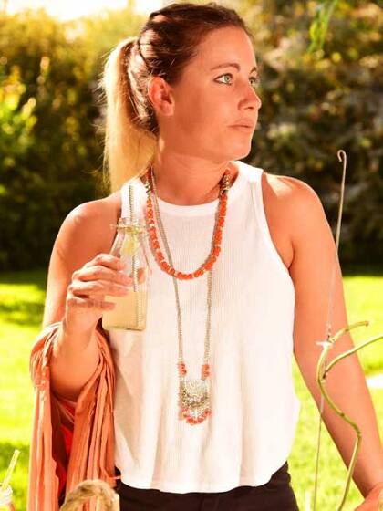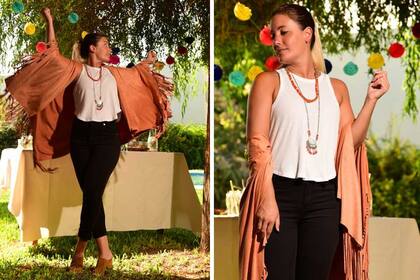 Los protagonistas: este poncho es el que se roba todas las miradas, es ideal para las noches frescas de verano porque es liviano y te va a servir también en otoño con un poco más de ropa abajo. Tiene una caída súper linda y los flecos se roban las miradas al moverte. El toque final es este collar con cadenas y cristales en color naranja que reflejan el blanco y el tono del poncho.