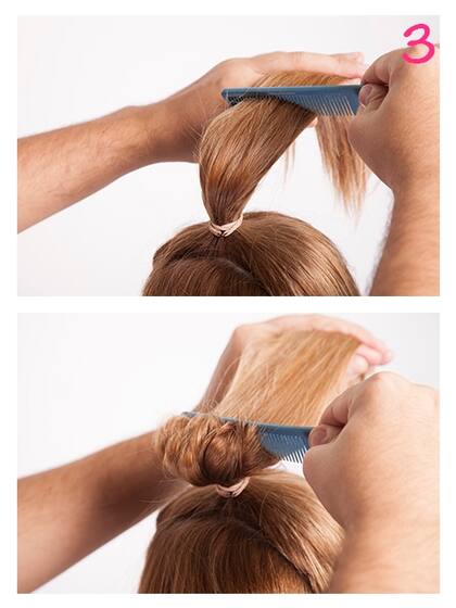Van a sostener la media cola desde la punta y batir un poco el pelo hacia la raíz para lograr más volumen a la hora de armar el rodete, si son de tener mucha cantidad de pelo, quizás no hace falta.