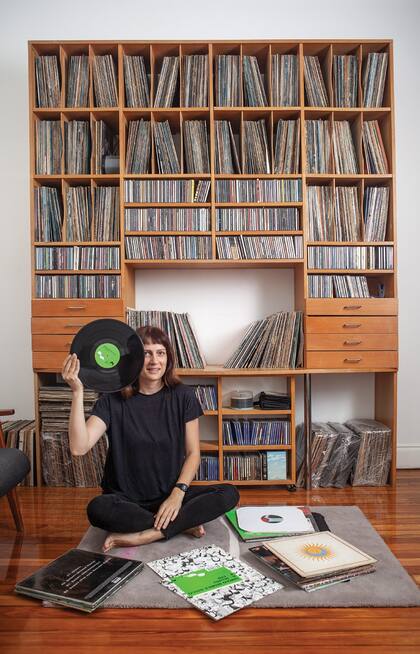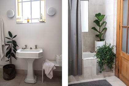 Flor armó el comedor con pocos muebles, "para no tener demasiada información en un solo sector". Diseñó una mesa en petiribí con patas cilíndricas y complementó con sillas blancas, macetas de cemento con base de hierro y un mueble antiguo heredado, que guarda la colección de libros de cocina de su marido. En un rincón del living: mesa Dúo (Nomo Estudio) y lámpara Fado blanca (Ikea), donde se destacan de fondo las molduras originales de las paredes. También, la antesala del dormitorio principal: "Como la habitación es enorme, generamos este espacio con un sillón, una alfombra y una biblioteca de piso a techo con los vinilos de Pato, que heredó de una disquería familiar y son la reliquia de la casa". A los tres les encanta la música y, como ritual diario, ponen un disco y bailan en el living para cerrar el día: "Es una fija que sale siempre". A veces, más infantil. Otras, la rockean.