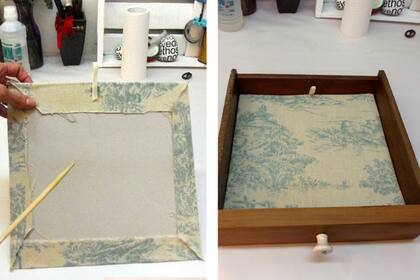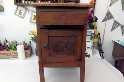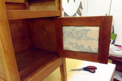 A veces hay que implementar otros recursos para decir: "listo, mueble terminado", como por ejemplo cambiar los tiradores y hasta entelarlo. En este caso, para poder disimular las manchas del cajón y el aspecto de la puerta vamos a usar tela y una lámina sobre un soporte para no estropear la madera .