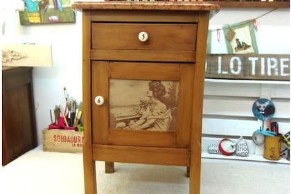 Además, para mejorar el aspecto de los sectores más deteriorados vamos a usar género y una antigua ilustración sobre un soporte de cartón , ya que la idea es trabajar con una técnica decorativa que pueda ser removida fácilmente y no estropee la madera.