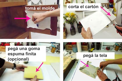El procedimiento es similar al anterior, pero sin goma espuma. O sea sacá el molde, pasalo al cartón y luego pegá la tela.