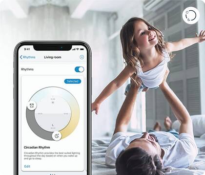 La función Ritmo Circadiano del sistema elige automáticamente el tipo de luz adecuado según la hora del día y el momento del ciclo, y también puede personalizarse según tus propios horarios, programando su encendido y apagado automático. Usá los efectos de iluminación para despertar naturalmente o al ir a descansar…luz fresca y enérgica con intensidad brillante para una mañana productiva, que cambia gradualmente a una luz tenue, cálida y suave, para una noche relajante. Es como seguir el ciclo del sol, pero en el interior del hogar.