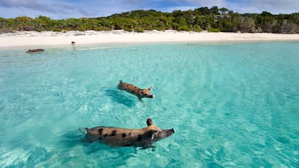 En otra playa de las islas Exuma, un grupo de simpáticos cerditos que habitan en el lugar son entusiastas nadadores y buena compañía para los visitantes. Al ver llegar los barcos, se aventuran al agua para reclamar atención y comida por parte de los turistas.