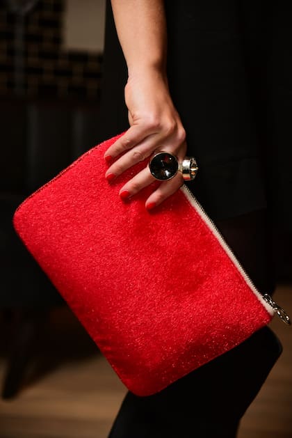 Los accesorios que llevo puesto son todos en la gama del colorado. Elegí este aro en cristales rojos y los anillos que son del mismo estilo junto con las pulseras, pero le sumé este collar de piel sintética bordó entrelazado en cadena que terminó de dar el toque para este look simple pero cargado.