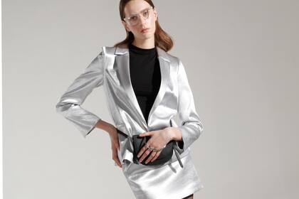 Sí, la mini vale para ir a la oficina. Si encima la combinás con un blazer en conjunto mucho mejor, ni qué decir si la elegís en un tejido satinado que aumente todavía más la buena energía femenina de un tailleur con falda. Esa es la propuesta del saco y la pollera Alpha de Ayres. Por debajo, la remera negra Crop Ivi de A.Y. Not Dead. Para darle el toque intelectual al look, los anteojos de lectura Max de Carla Di Sí. Como cartera, nada de portafolio, ni siquiera una tote bag: la mini bag Eunice de Prüne
