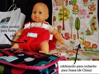 Nota de color: Ahhh, el viernes nació la quinta prima de mis hijas, Juana. Hija del hermano de Fede y de mi cuñada. ¡Bienvenida Juana! Todavía mis niñas no pudieron conocerla, pero hete aquí que JUSTO, JUSTO en el momento en que Juana estaba aterrizando, nosotras, sin saberlo, estábamos recibiendo unos preciosos regalos (encargados) para ella. No soy de mencionar marcas, a menos que se trate de emprendimientos de lectoras que por algún motivo me entusiasman mucho... ¡Y éste es el caso! Me enamoré de los colchoncitos para cochecitos (¡no sabía que existían! Lo que los necesité en su momento), y de una sillita portátil de tela, para atar a cualquier silla grande, que me pareció utilísima. Si quieren quedar bien con un regalo o si necesitan para sus propios hijos, les recomiendo los productos de Gabriela, sin dudarlo: Lorenza Básicos