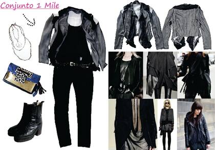 Hay varias maneras de usar el negro dándole una vuelta y que no nos resulte aburrido, por ejemplo, usando capas y diferentes texturas. Aunque todo sea del mismo color combinando diferentes materiales y capas de tela el conjunto se vuelve mucho más interesante. En el conjunto 1 todas las prendas son de diferentes texturas, el saco es de gasa, forrado con raso blanco, esto da el efecto de tonos grises dependiendo la zona, es un saco muy original y como le gustó mucho, no es una ganga pero vale la inversión (liquidación $600 Garza Lobos). Por el costo, decidió completar el look con prendas que ya tenía y que todas solemos tener en nuestros guardarropas. A la musculosa básica de modal la decoró con un galón de flecos tipo charleston ($25 el m aprox, se consigue en cualquier mercería y se cose fácilmente en el borde de cualquier remera), el pantalón es de gabardina (similares en Inversa $199) y las botas vintage de simil croco ($50 feria Caritas de San Isidro). La cartera (liquidación $548, Calletanas) si bien no es toda negra, mantiene este juego de las diferentes texturas combinando cuero y pelo, y le da un toque de color al conjunto.