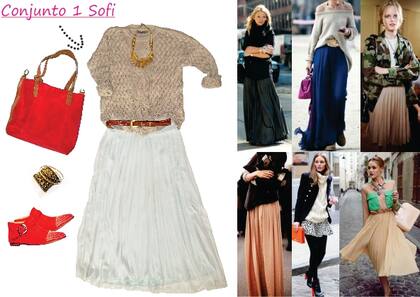 Sofi como verán prefiere los colores tierra, los pasteles y el crudo. Se siente mucho más cómoda, ya que al ser tan blanca y pecosa esos colores le van muy bien. En el conjunto 1 eligió una pollera plisada de gasa verde agua bien clarito (Kosiuko temporada anterior aprox. $600) que se pueden conseguir de esta temporada en Zara, Inversa o sino en Aliexpress hay de todos colores y les llegan justo para el veranito. La combinó con un sweater con un ocho en el centro de un color gris oliva (liquidación $399, Zara) que le da un toque más rústico al conjunto y le quita formalidad a la falda. Le costó mucho conseguir un sweater de este estilo a buen precio, el de Zara no es una ganga pero es muy lindo y tiene muy buena calidad de hilado. El cinto es vintage de cuero marrón con la hebilla dorada. Lo terminó con una cartera de gamuza roja (liquidación $274, Isadora) y unas botitas divinas de gamuza también roja (liquidación $650, Cest Fini) Sofi no suele combinar la cartera con los zapatos, está prácticamente en contra de la norma jaja pero en este caso queda muy interesante al ser larga la falda se ven las puntitas rojas y queda genial. Por último le agregó un collar dorado ($69, Isadora). Es un conjunto con prendas muuuuy versátiles. Es una buena opción para las faldas que quizás usaron solo para un casamiento o fiesta más arreglado y de esta forma le damos un uso más cotidiano.