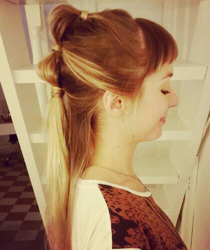 2. Volvemos dividir el pelo (incluyendo el que sale de la colita anterior) y lo volvemos a agarrar con otra de esas colitas chiquitititittitas.