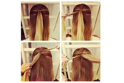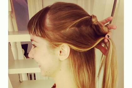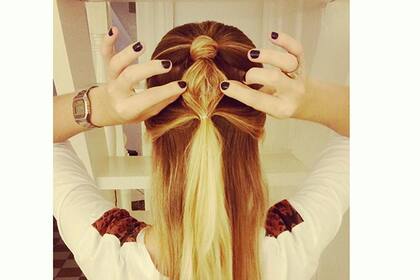 1. Hacemos media colita, con una de esas gomitas chiquitas que venden en Todo Moda, o en los lugares de cosas especificas para el pelo y la envolvemos con un mechón de la colita. Ponemos un poco de pray para fijar y seguimos con el paso nro 2!