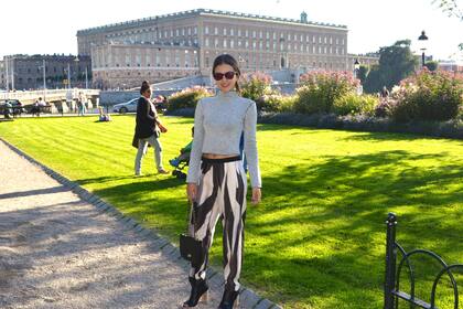 Arriba opté por un tejido en plata, que es la prenda que le otorga el aire tecnológico al outfit, junto con las gafas metalizadas y el detalle del accesorio en el pelo.