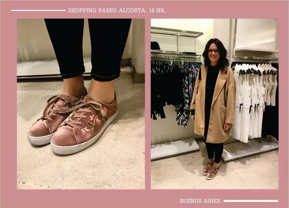 El de la primer foto fue medio de casualidad, ya que yo andaba chusmeando las prendas en uno de mis locales preferidos y me tropecé con esta chica, súper simpática y predispuesta a ser una de mis propuestas en el coolhunting de esta semana. Las zapatillas me parecieron divinas y tanto el bordado como el terciopelo son dos tendencias que no faltan esta temporada. Además, tenía un tapado oversized en color camel que combinaba perfectamente con el rosa viejo de sus zapatillas.