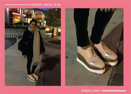 Por último, vuelvo a mostrarles los zapatos con plataforma combinada que son furor en todos lados desde hace ya unas temporadas atrás. En este caso, eran con estrellas metalizadas y los combinó con una bufanda a tono.