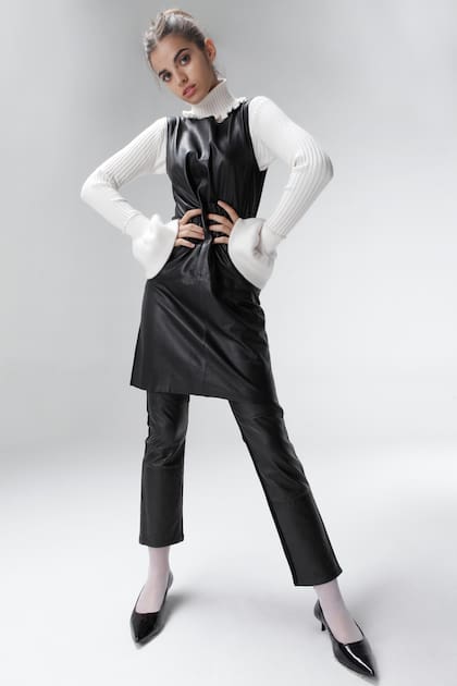 Una combinación genial de texturas. La suavidad y calidez de los tejidos con el brillo y el toque rebel que aporta el cuero. La superposición es clave para lograr este efecto, que se multiplica si mezclás cuero con cuero. Un vestido sin mangas (divino el modelo Jackie de Redondo Frydman) sobre un pantalón recto. La primera capa es la polera Cavedish con detalle de puños XL de Las Pepas. En los pies: zapatos Reno de Hush Puppies, en punta y de taco bajo.