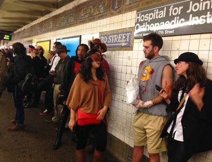 Ok, pueden llegar a pensar que estoy inventando todo. Que estoy describiendo el remake de una película surrealista. Pero: ¡no! Esta imagen es común el día de Halloween en Nueva York . En la calle predomina la gente con disfraz sobre el transeúnte corriente.