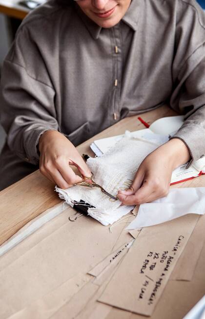 Al entrar al taller de Lucía en Bernal, quedás en evidencia. Acá no hay lugar para el ritmo frenético, el ruido y el estrés. Es como un mundo paralelo. Tranquilo. Ensimismado. Ella entra, despliega telas y moldes y se olvida de todo lo que pasa afuera. Trabaja en silencio. Tiene una flamante máquina de coser Brother recién traída de uno de sus viajes, pero también tiene una Bee Brand antigua, de su abuela húngara que se dedicaba a la sastrería, ahí, como testigo de todo su trabajo. Su abuela fue la que le enseñó a coser. Le confeccionaba la ropa cuando era chica y logró que se fanatizara cosiendo camisas y sacos: "Son mis prendas preferidas para diseñar. Supongo que me lo contagié de ella", cuenta.