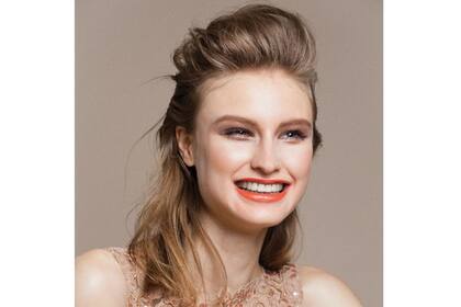 ¿Qué se hizo? Luego de preparar la piel, se aplicó una base y corrector para emparejar el tono y disimular imperfecciones. En los ojos se hizo un esfumado con una paleta de marrones, ocres y dorados que se reforzó con la máscara de pestañas. Para las mejillas, un rubor en tono durazno (que da mucha luz) y en los labios un naranja vibrante. El pelo, bien natural con un jopo hacia el costado logrado con un poco de batido, spray y secador.