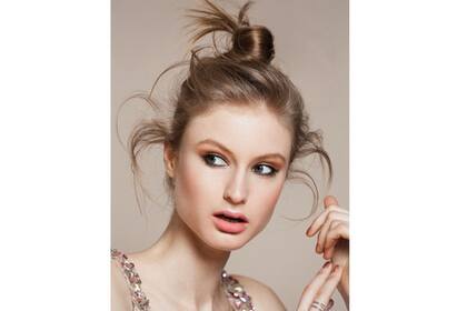 ¿Qué se hizo? Después de la base y el corrector, se resaltaron los puntos de luz con iluminador. Se hizo un esfumado con sombra dorada en los párpados, un delineado superior e inferior con crayón de khol y se aplicó mucha máscara de pestañas. En mejillas, rubor durazno y un tono bien tranqui en los labios. El peinado, también de estilo despeinado, con un rodete en el centro en forma de nudo.