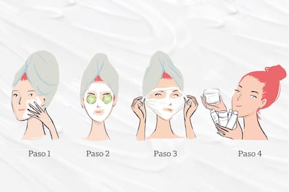 - 2. Extendé una capa generosa del producto en la cara y el cuello. Si es en crema, se aplica con movimientos circulares y ascendentes. Si es una sheet mask, solo colocala sobre el rostro.
