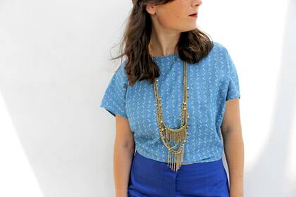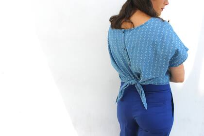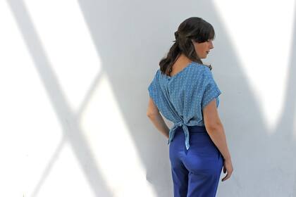 Lo acompañamos con una blusa estilo navy con nudo en la espalda y mini estampado de anclas. Esta prenda es un buen comodín, va con todo y se adapta a muchísimas situaciones de uso. Podemos usarla con un jean tiro bien alto y queda estupendamente.
