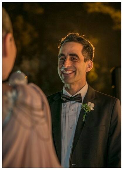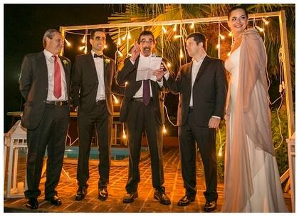 4. Ahí, en un espacio de ceremonia hecho con una estructura de luces de Wedding Factory, nos esperaba Martín, mi primo. Lo elegimos para conducirla porque nos conoce bien a los dos, y ¡porque es muy bueno para hablar en público! Sabíamos que lo que dijera iba a ser simple, al grano, y de corazón, y que no le iba a agarrar un panic attack. En fin, cuando llegué a donde estaban Nacho y él, ¡Martín ya estaba llorando! Así que le di un abrazo.