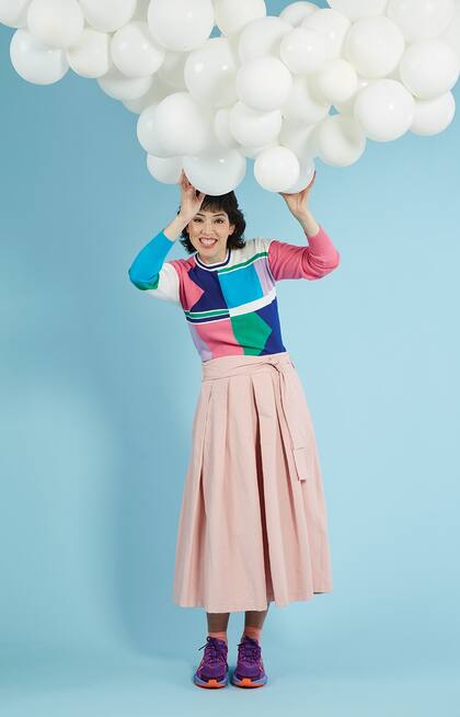 Virginia Gandola (editora de moda). Suéter, Las Pepas, $5490. Falda, Valentina Karnoubi, $12.810. Soquetes, Medias Mora. Zapatillas, Adidas, $8499.