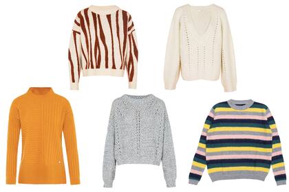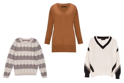 Combinado, Uma, $7500. Clásico, Uma, $7500. En mostaza, el color de la temporada, Perramus, $6070. Gris melange, Uma, $6900. A rayas, Rapsodia, $8900.
