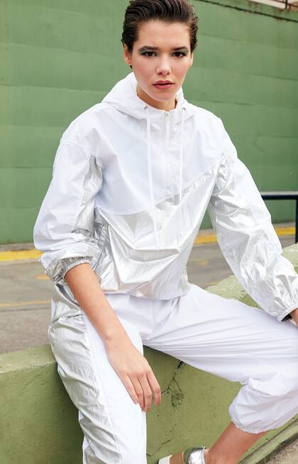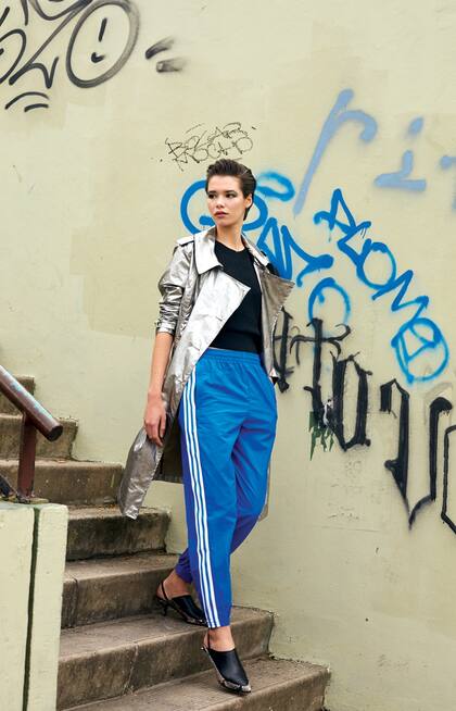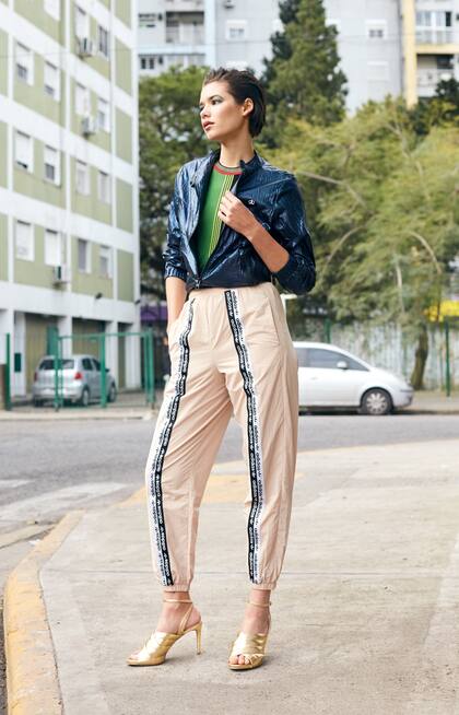 Trench metalizado, Perramus, $12.700. Top tejido, Rapsodia, $4900. Pantalón jogger, Adidas Originals, $3199. Zapatos combinados, Blaqué, $6900.