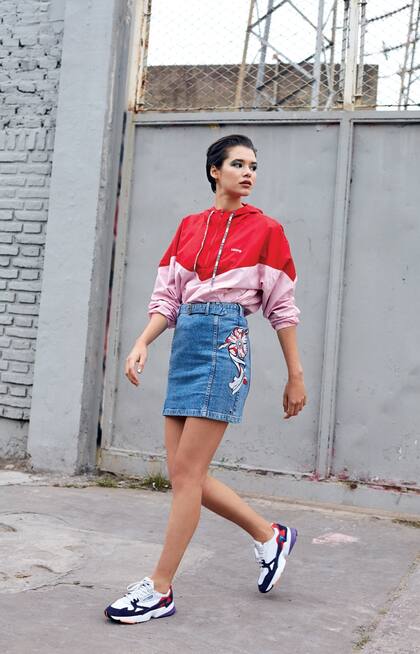 Campera deportiva, Levi´s, $6490. Falda bordada, Tommy Hilfiger. Zapatillas, Adidas Originals, $4999.