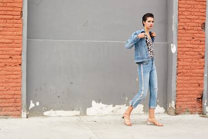 Chaqueta, Levi´s. Pantalón de denim con aplique de strass, Levi´s, $8490. Musculosa animal print, Mirta Armesto, $5514. Sandalias, Blaqué, $6290.