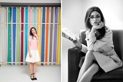Izquierda: vestido, Markova, $2400. Suéter, Basement, $700. Reloj, Swatch, $3800. Guillerminas, Salman, $3400. Derecha: trench, Perramus, $4200. Gafas, Vulk Ginger, $2300.