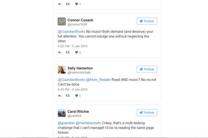 Entre ellos: "No,no,no ... No puede hacerse", "Es un desafío de tareas múltiples que no podría manejar. Estaría leyendo la misma página una y otra vez" y "Sin música. Ambos demandan (y merecen) una atención completa. No se puede hacer bien una sin desatender la otra".