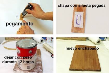 1. Sobre el lado del enchapado que se va a ver, colocá una capa fina de pegamento universal. Encima, pegá la silueta calcada en el papel.