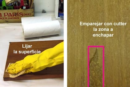 1.Emparejar: lijá con grano 180 la superficie y luego con 360. Lo razonable es realizar esta operación en toda la superficie en la que se encuentre el faltante (por ejemplo, el estante completo) para que resulte más fácil emparejar colores y lustres.
