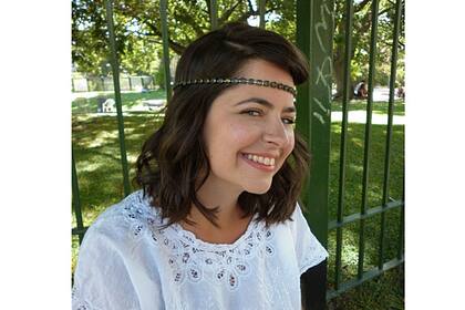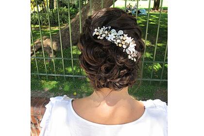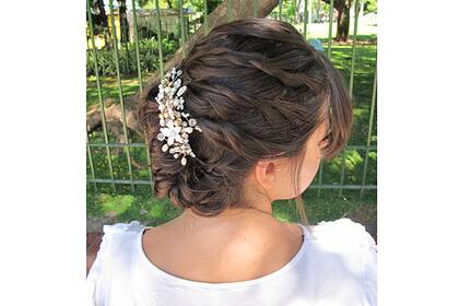 Este peinado me lo hizo Julieta Alonzo. Ella me imaginó con un estilo años 20, y se inspiró en la película de Woody Allen "Medianoche en París". Agregó un detalle de cadena con cristalitos verdes que me encantó. Creo que interpretó perfectamente mi lado lúdico, y me gustó que su peinado es arreglado y, a la vez, muy original. Ella me dijo "a vos te hago un peinado como me haría yo para casarme". Juli es una antinovia total.
