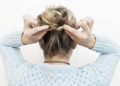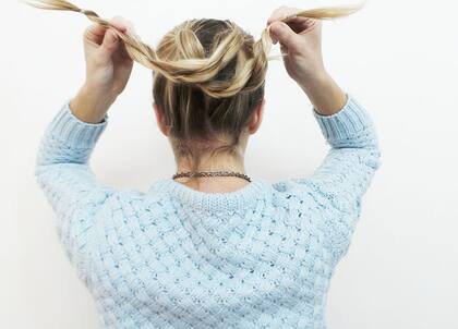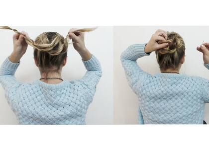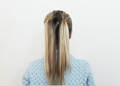 2- Hacete dos colitas, a mitad de cabeza. Usá las gomitas finitas y transparentes que usamos siempre, para que no se vean.