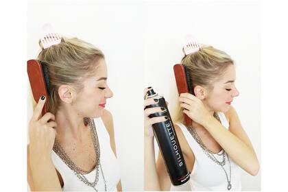 Dos gomitas transparentes, peine de batido, cepillo de cerdas y spray. En este caso usamos el "Silhouette" de Schwarztkopf porque es de fijación fortísima y para este peinado es ideal que nos quede bien bien bien fijo.