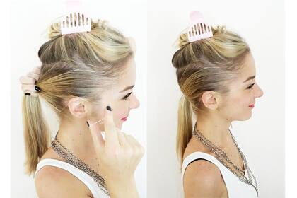 4- Háganse una colita baja con la mitad de pelo de abajo, agarrándola con una gomita de las transparentes. Bien ajustada y pegadita al cuero cabelludo.