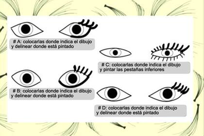 En el dibujo pueden ver en qué lugares les conviene poner pestañas, varía según cada tipo de ojo. Los diferencié por A, B, C Y D, porque no me gusta ponerle nombres a las formas de los ojos. Siempre los presentan como "ojos caídos" "ojos tristes" "ojos saltones", parece que fueran defectuosos y no es así, cada ojo tiene su encanto.. Ustedes vean cual es el suyo y síganlo. La cantidad de pestañas a poner varía según el tamaño del ojo.