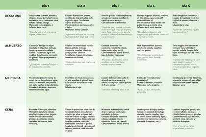 Son ideas de menú generales, las cantidades e indicaciones varían de acuerdo a la persona, el sexo, actividad física y patologías de base. Se recomienda individualizar el plan de alimentación.