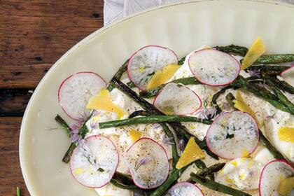 La burrata se sirve con los rabanitos y los pedacitos de la cáscara de limón esparcidos por arriba, acompañada de los espárragos dorados y de unas flores de ciboulette.