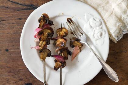 Cortar los hongos por la mitad y dorarlos en una sartén. Después, pincharlos en un palito, intercalando cebollas rojas en gajos. Volver a la sartén y dorarlos vuelta y vuelta. Finalmente, agregar la soja, la miel y el aceto mientras se terminan de cocinar.