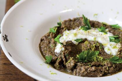 Después, colocar por arriba el yogur colado, la ralladura de limón, las hojas de perejil, el aceite de oliva, la sal y la pimienta.