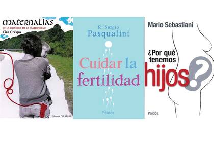 De izquierda a derecha: Maternalias: la historia de la maternidad. Cira Crespo. (Ob Stare, $260). Cuidar la fertilidad. Doc. Sergio Pasqualini. (Paidós, $229). ¿Por qué tenemos hijos? Mario Sebastiani. (Paidós, $135).