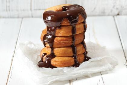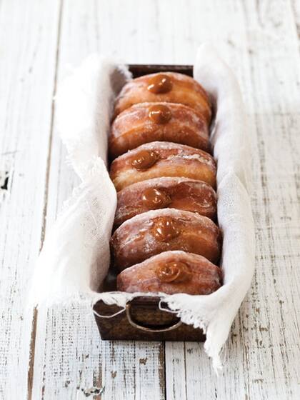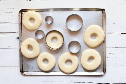 ¿Cómo se hace? Mezclar la levadura con la mitad de la leche y 1 cucharada de azúcar. Dejar levar hasta que burbujee. Aparte, unir el resto del azúcar con la harina, hacer un hueco y agregar la mezcla anterior. Integrar todo con las manos hasta lograr una masa homogénea. Amasar por 5 minutos y dejar levar en un bol aceitado, tapado con un repasador húmedo. Una vez levado, estirar a 2 cm de altura. Para las donuts glaseadas, cortar la masa con un aro de 8 cm y el centro con uno de 3 cm. Para las rellenas, cortar aros de 6 cm. Colocarlas todas en una placa aceitada, cubrir con film y dejar levar por 30 minutos. Luego, calentar una olla con aceite. Cuando la masa esté levada, freír las donas en tandas de a tres, de ambos lados, hasta que queden doradas. Escurrir en una placa con papel absorbente.