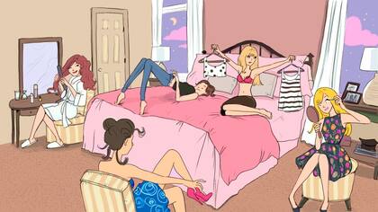 Es el turno de tus amigas. Improvisan intercambios de tops y accesorios. Prueban, evalúan y deciden los últimos detalles. Al final los aros que te compraste para hoy, los usa una de tus amigas y vos terminaste con una vincha que te queda mucho mejor que esos “obeliscos que colgaban de tus orejas”, según la más ácida del grupo.