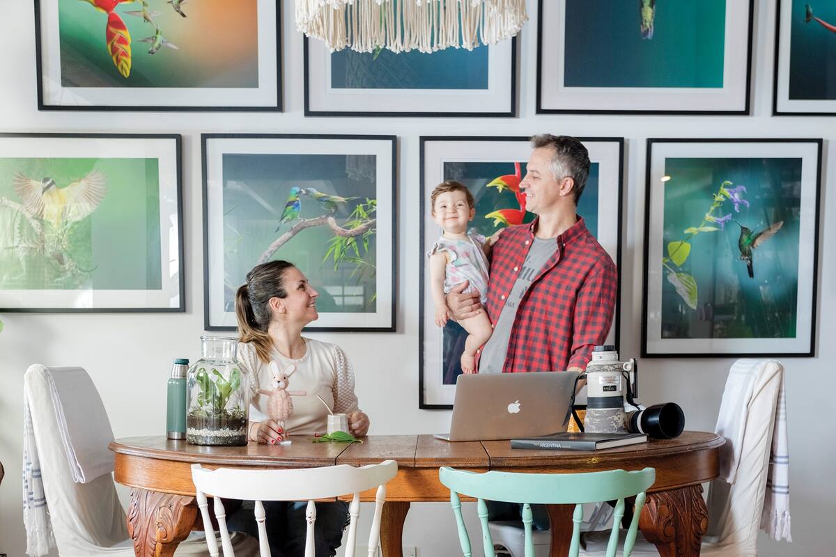 La ex galería se convirtió en el sector social, donde se mantuvo el piso original de pinotea. Armaron el comedor con mesa y sillas del Mercado de Pulgas, una lámpara de macramé hecha por las manos de Vero Alessandrini y una composición de cuadros con fotos de Nico, de la serie "Naturaleza fugaz": "Son de la selva misionera y del jardín de casa. Armo la escena y espero a que las aves se metan en el set", una técnica muy especial, que da resultados únicos y poco predecibles.