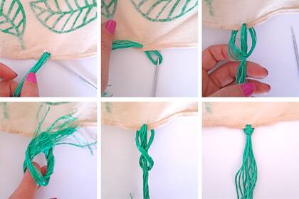 Para armar el fleco pasamos la aguja como dijimos antes, y agarramos los hilos por el centro. Pasamos todo hacia el lado del derecho, y ahora con los dedos lo pasamos por el ojal que se forma y antes de hacer el nudo y tirar, lo volvemos a pasar. Por ultima tiramos bien, hilo por hilo para ajustarlo. Volvemos a repetir esto en todo el contorno del pañuelo ¡Y listo!